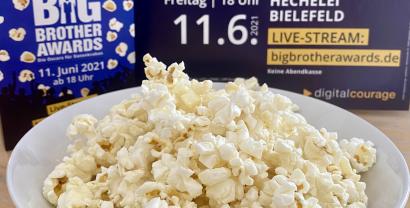Am 11. Juni um 18 Uhr heißt es das Popcorn rausholen und zurücklehnen für die Liveschalte der aktuellen BigBrotherAwards. Dieses Jahr gibt es dazu ein ganz besonderes Angebot: Wer ganz schnell im Digitalcourage Shop eines der limitierten Streamtickets bestellt, tut Gutes und bekommt noch eine exklusive Packung #BBA21-Popcorn dazu.