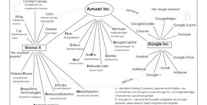 [^2]: „Alphabet ist vielmehr eine Sammlung von Unternehmen. Von denen das Größte natürlich Google ist. Das neue Google ist ein wenig abgespeckt, die Unternehmen die zum Teil fern unseres Kerngeschäfts mit Internetprodukten liegen, sind nun stattdessen in Alphabet enthalten.“ Larry Page, CEO