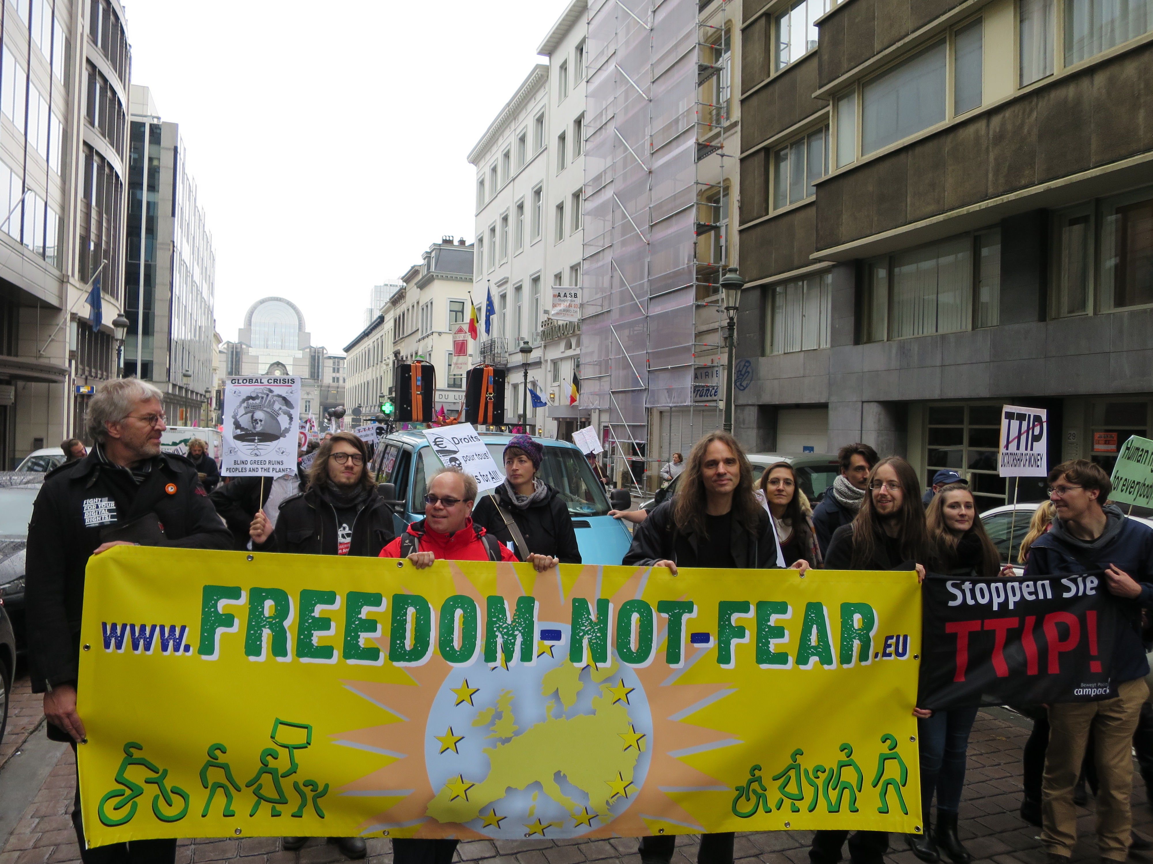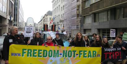 Am Samstag, 17. Oktober 2015 hat Brüssel gegen TTIP demonstriert und wir waren mit Lautsprecherwagen, Flyern und den Teilnehmenden von „Freedom not Fear“ dabei. Unsere Botschaft war klar: TTIP, TiSA und Co. gefährden Datenschutz und Grundrechte in Europa.