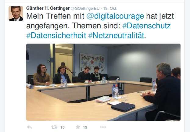 Außerdem haben wir uns mit Digitalisierungskommissar Günther Oettinger getroffen und deutlich gemacht, dass nach dem „Safe Harbor“-Urteil kein Zweifel mehr daran besteht, dass dringend datenschutzfreundliche Angebote in Deutschland und Europa gebraucht werden.