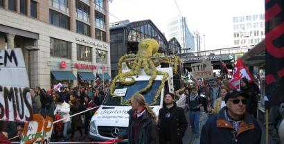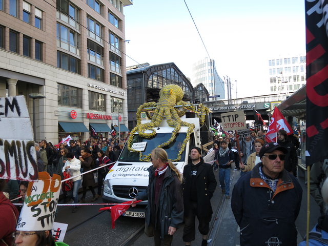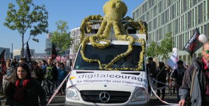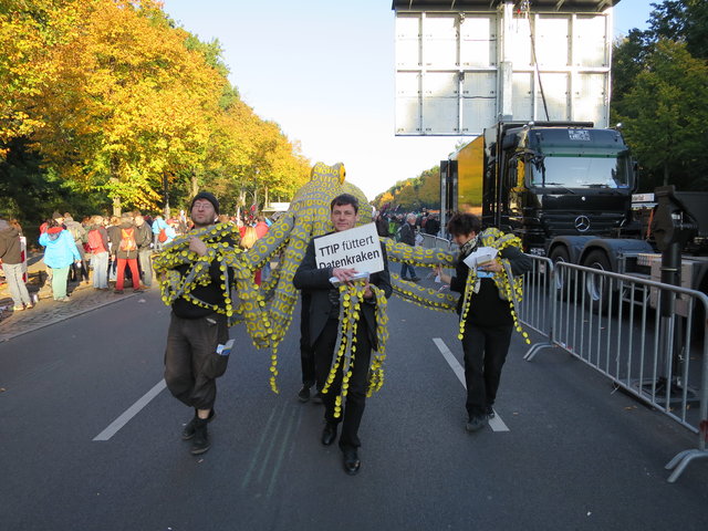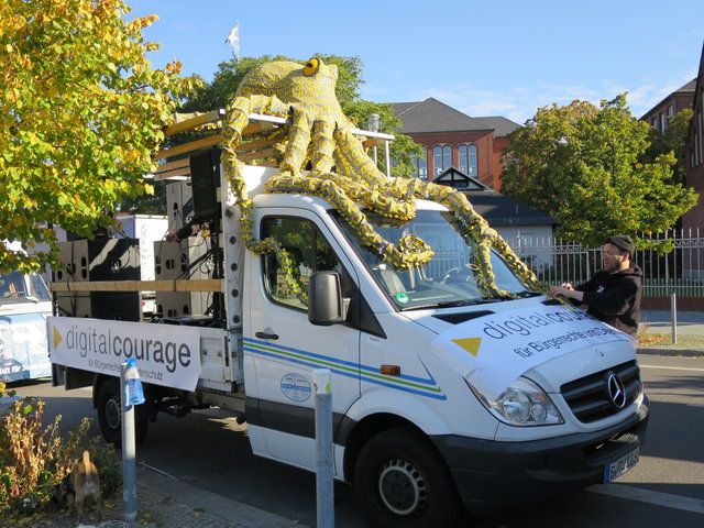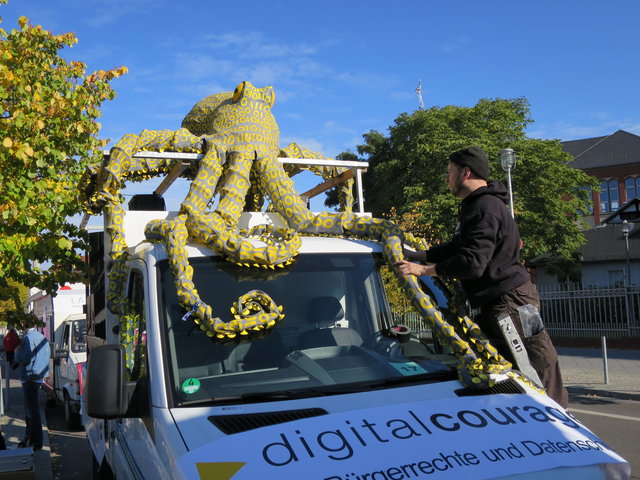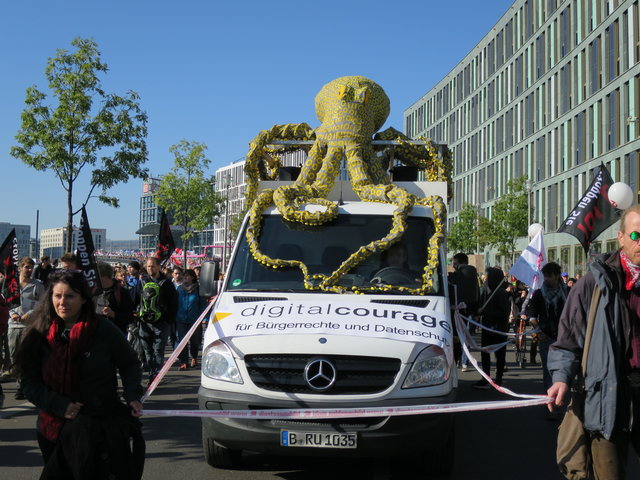 Wir waren mit einem eigenen Lautsprecherwagen, inklusive unserer neuen Datenkrake auf dem Dach, mittendrin und haben auf die Gefahren der Abkommen für den Datenschutz in Europa aufmerksam gemacht. Immer wieder rief unser Gründungsvorstand padeluun zum Widerstand gegen den "Datenfreihandel", der mit TISA, CETA und TTIP droht, auf.