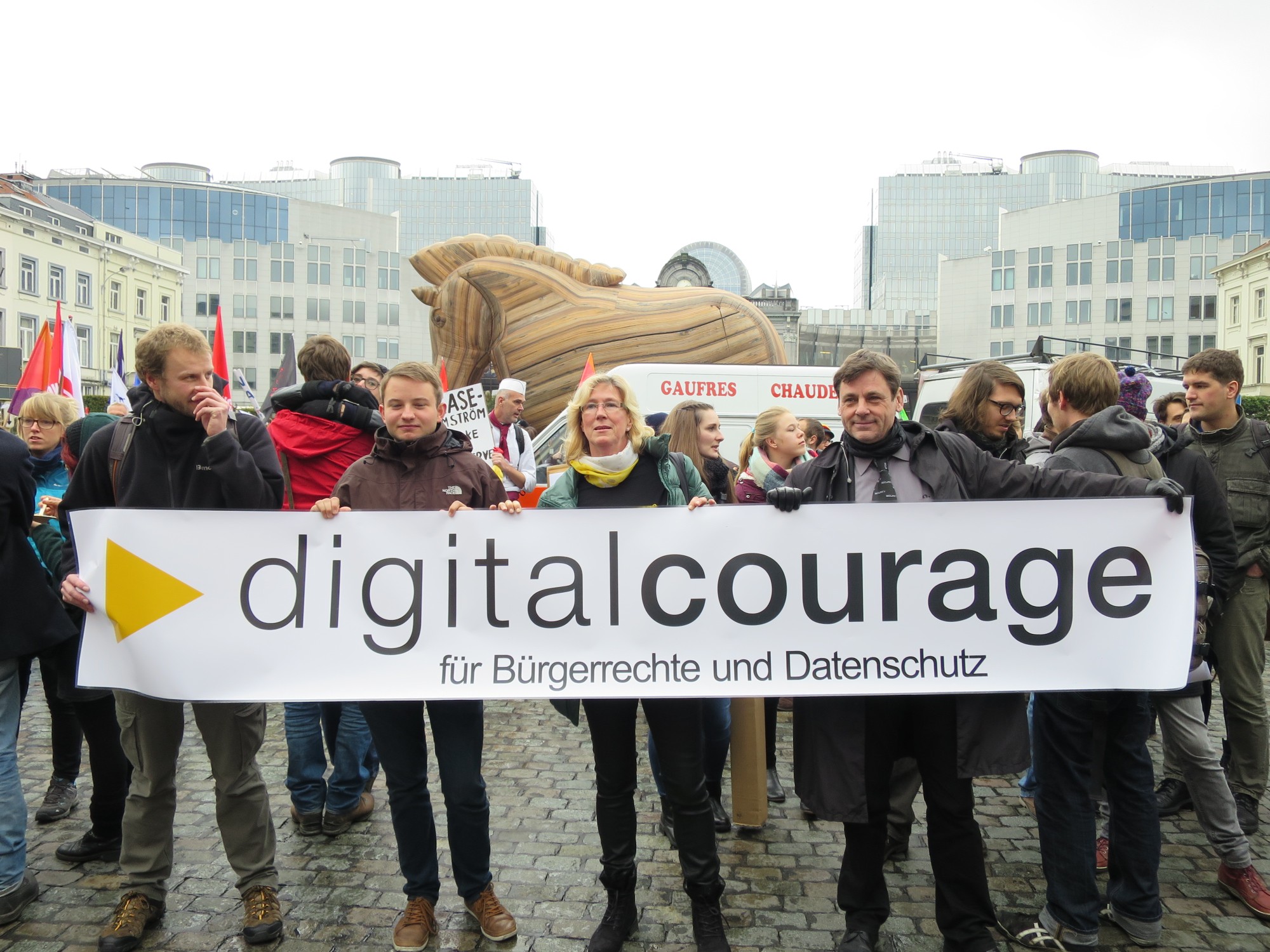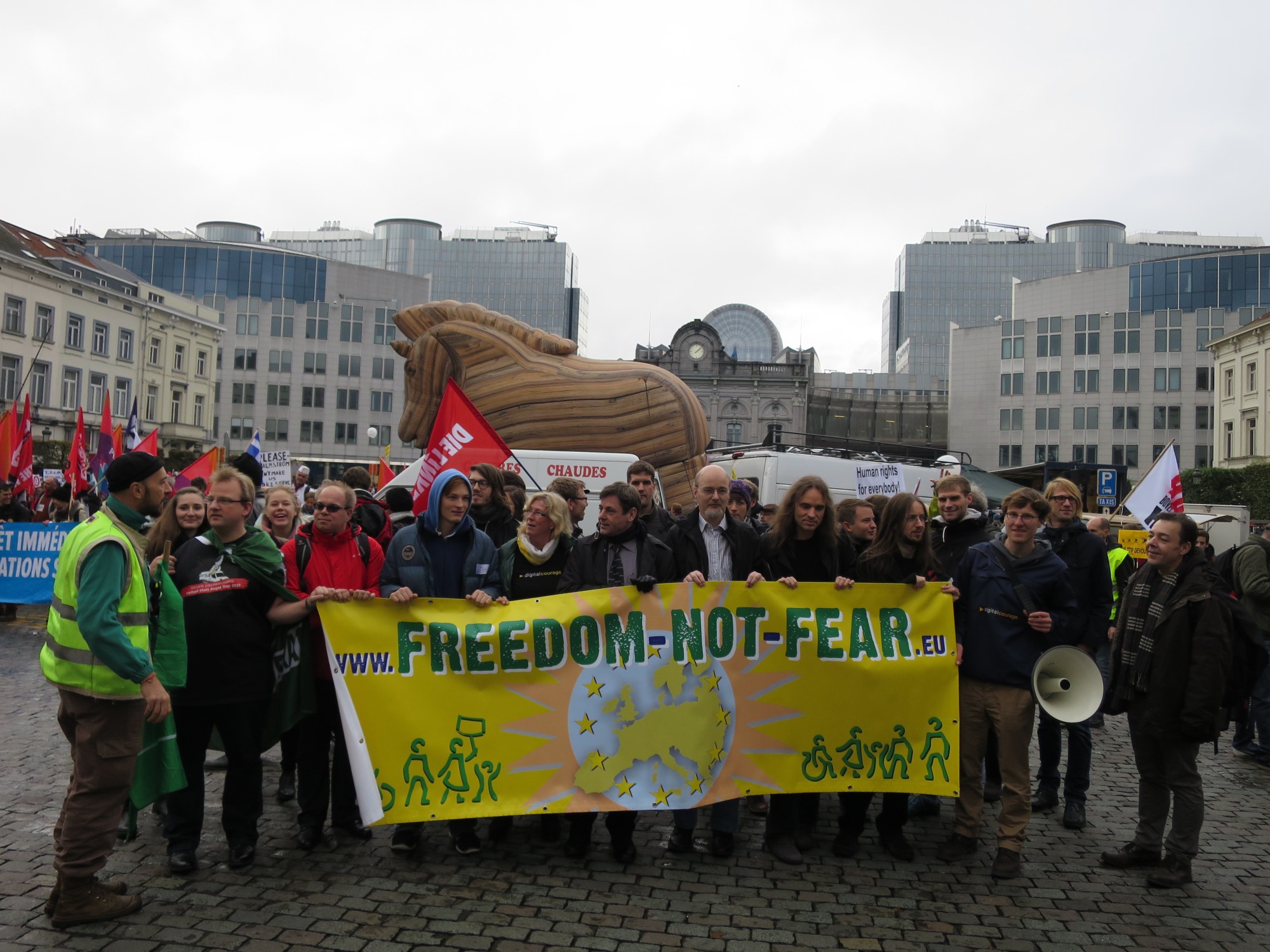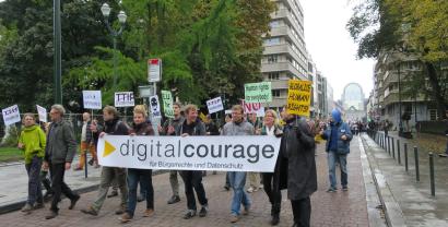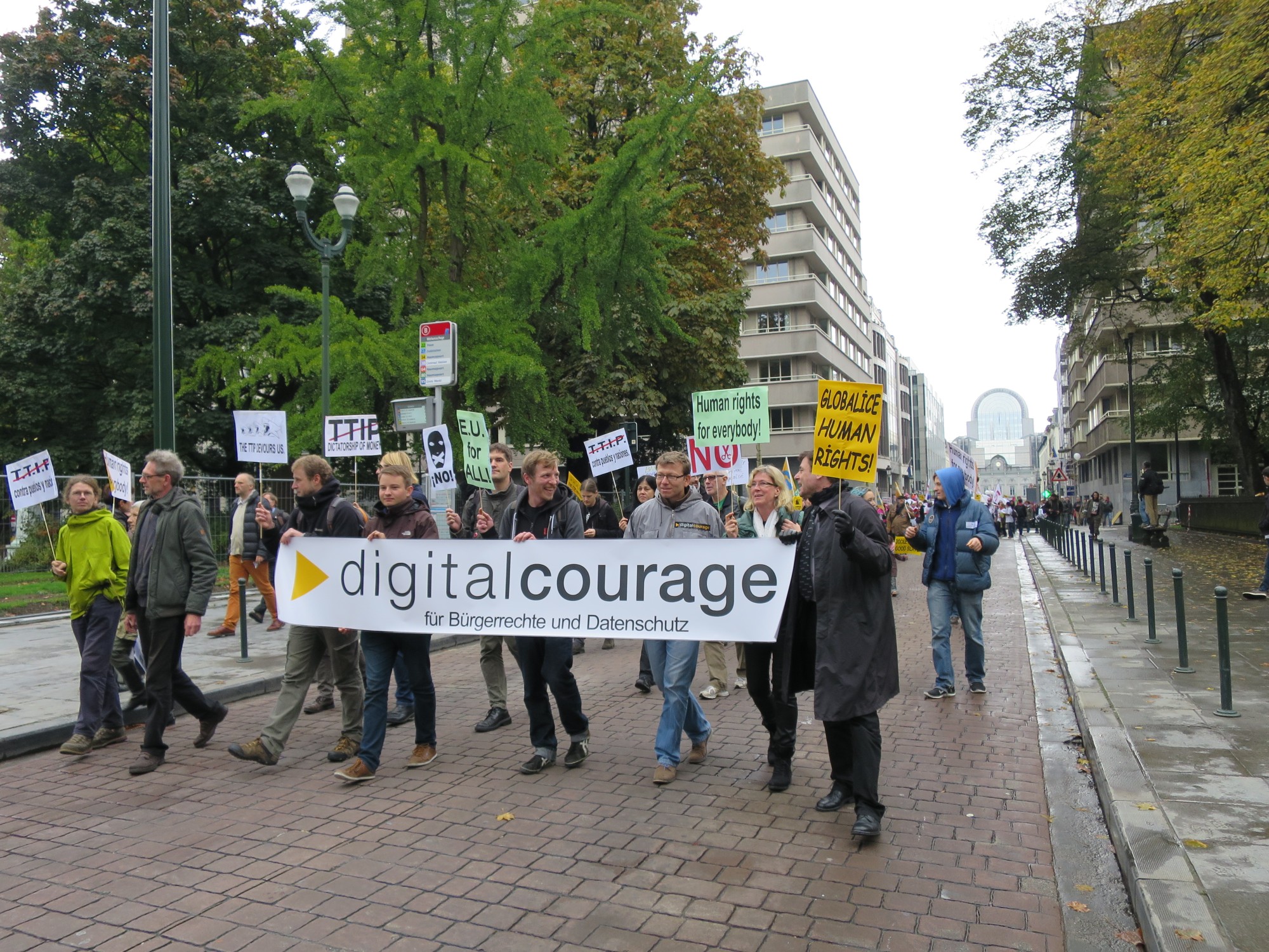 Mindestens einmal jährlich treffen sich Aktivistinen und Aktivisten, die sich mit Netzpolitik beschäftigen in Brüssel, um über Strategien und Aktionen für eine lebenswerte digital vernetzte Welt zu reden. Dazu gehört es auch, jeweils am Samstag eine Aussenaktion zu unternehmen. In den ersten Jahren waren dies unsere "Freedom not Fear"-Demonstrationen, in den Folgejahren unternahmen wir „Architekturrundgänge“, bei denen wir „Gebäude der Macht“ (Botschaften, Bürogebäude mit Lobbygruppen) besichtigten. In diesem Jahr haben wir uns in die große Anti-TTIP-Demo in Brüssel eingereiht und waren Teil eines großen Demonstrationsbündnisses mit Teilnehmerinnen und Teilnehmern aus fast allen europäischen Ländern.
