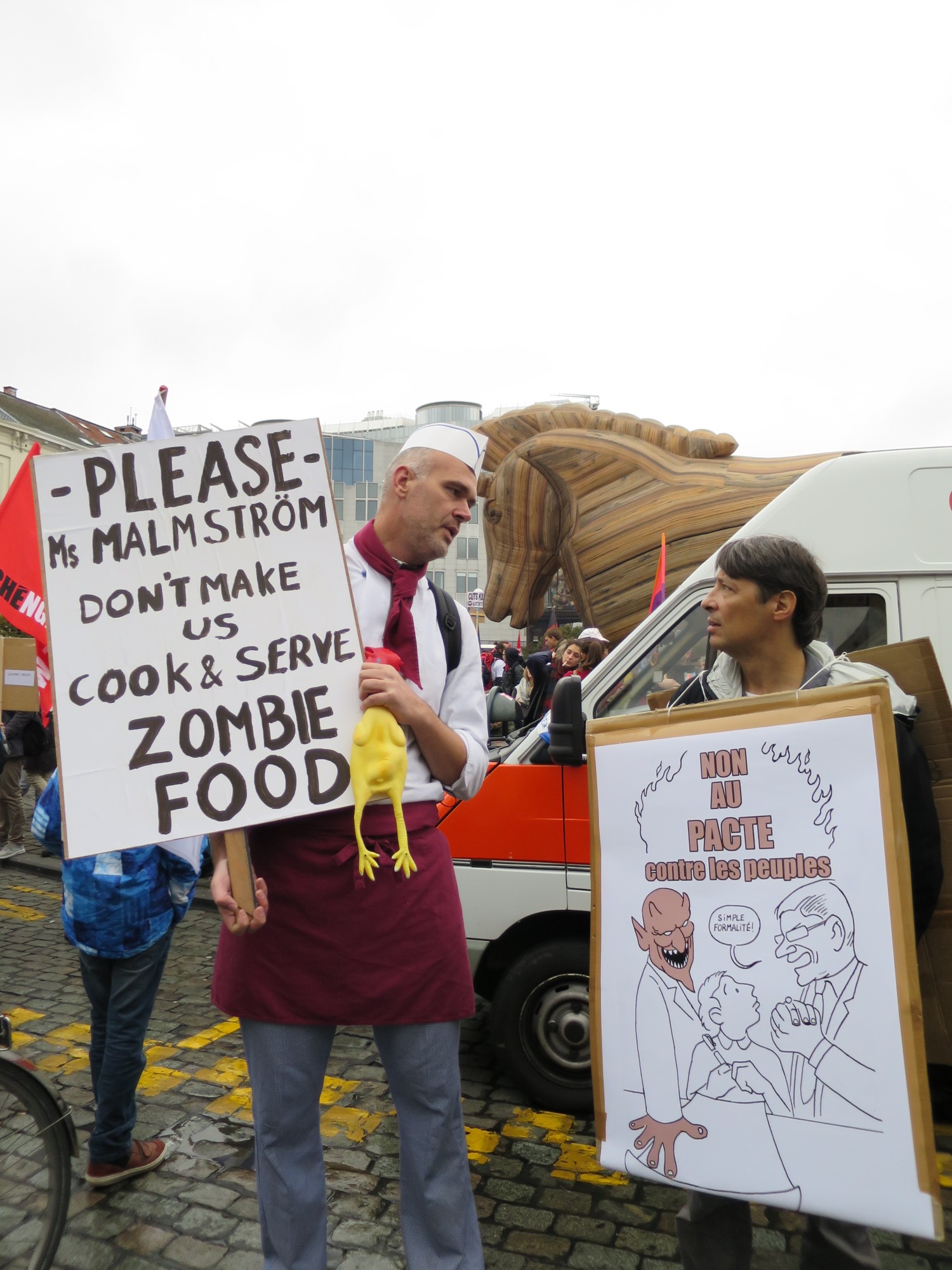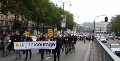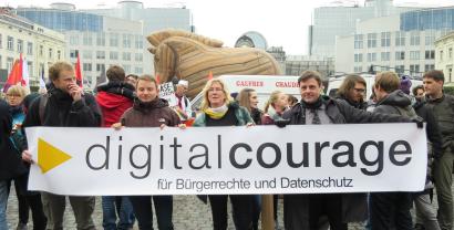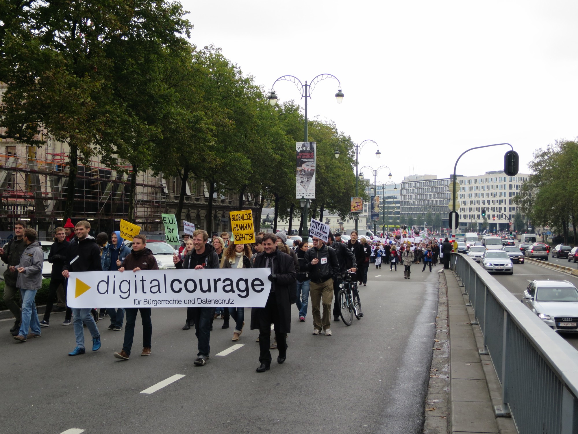 Mindestens einmal jährlich treffen sich Aktivistinen und Aktivisten, die sich mit Netzpolitik beschäftigen in Brüssel, um über Strategien und Aktionen für eine lebenswerte digital vernetzte Welt zu reden. Dazu gehört es auch, jeweils am Samstag eine Aussenaktion zu unternehmen. In den ersten Jahren waren dies unsere "Freedom not Fear"-Demonstrationen, in den Folgejahren unternahmen wir „Architekturrundgänge“, bei denen wir „Gebäude der Macht“ (Botschaften, Bürogebäude mit Lobbygruppen) besichtigten. In diesem Jahr haben wir uns in die große Anti-TTIP-Demo in Brüssel eingereiht und waren Teil eines großen Demonstrationsbündnisses mit Teilnehmerinnen und Teilnehmern aus fast allen europäischen Ländern.