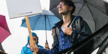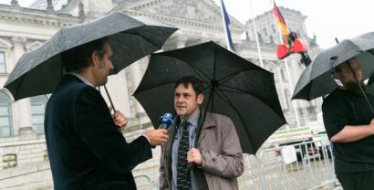 „Trotz Dauerregen gegen Vorratsdatenspeicherung protestieren – die Leute hier und unsere Bündnispartner wissen, warum sie heute vor dem Bundestag stehen“, sagt padeluun, Gründungsvorstand von Digitalcourage.