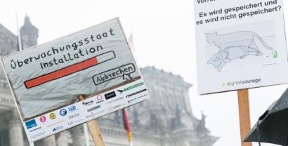 Demoschilder, eins mit dem Text: „Überwachungsstaat Installation“