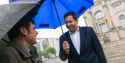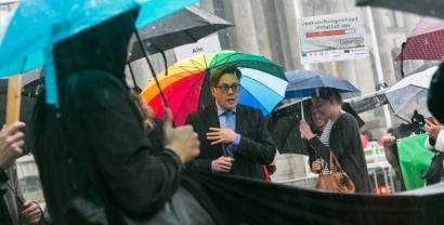 Zwei Personen (u.a. padeluun) unter zwei Regenschirmen.