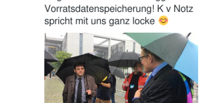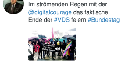 Screenshot von Twitter – Konstantin v. Notz: Im strömenden Regen mit der @digitalcourage das faktische Ende der #VDS feiern #Bundestag
