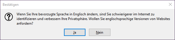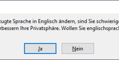 Wir empfehlen, dies mit Ja oder Yes zu bestätigen, weil Sie dadurch noch besser „in der Masse untergehen”, Ihre Anonymität also besser geschützt ist. Auf mehrsprachigen Websites sehen Sie dadurch die Inhalte eventuell zuerst auf Englisch. In der Regel können Sie in der Website eine Sprachauswahl finden. Wenn die englischen Inhalte und der Klick auf einen Sprachwechsler für Sie unangenehm sind, können Sie aber auch gerne ablehnen und damit den Websites mitteilen, dass Sie Deutsch bevorzugen.