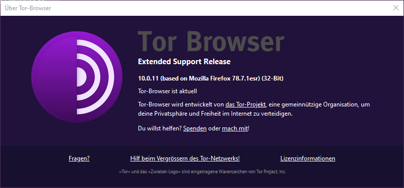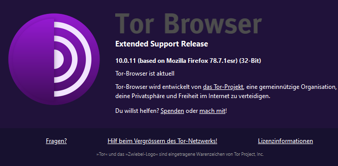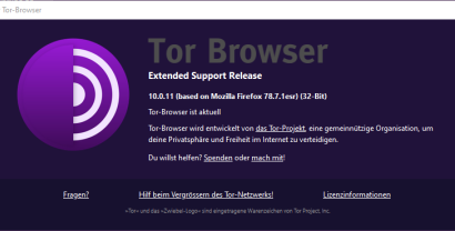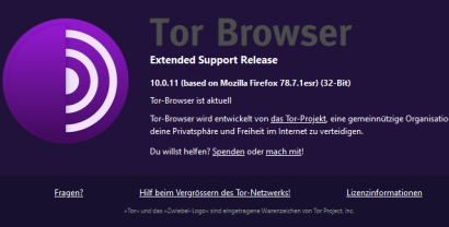 Nach dem Start prüft der Tor-Browser selbstständig, ob Updates verfügbar sind und lädt sie automatisch herunter. Sie werden allerdings erst nach einem Neustart des Browsers eingespielt. Ein kleines Warnsymbol auf dem Menübutton oben rechts im Browsers-Fenster weist darauf hin, ob Updates zur Installation bereit stehen. Wer manuell auf Updates prüfen möchte, kann oben rechts auf den Menübutton, dann auf Hilfe und anschließend auf Über Tor-Browser klicken.