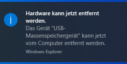 Bevor Sie den Stick vom Rechner entfernen, sollten Sie ihn sicher zu trennen. Dazu klicken Sie unten im Infobereich unten rechts auf das Symbol für Wechseldatenträger.